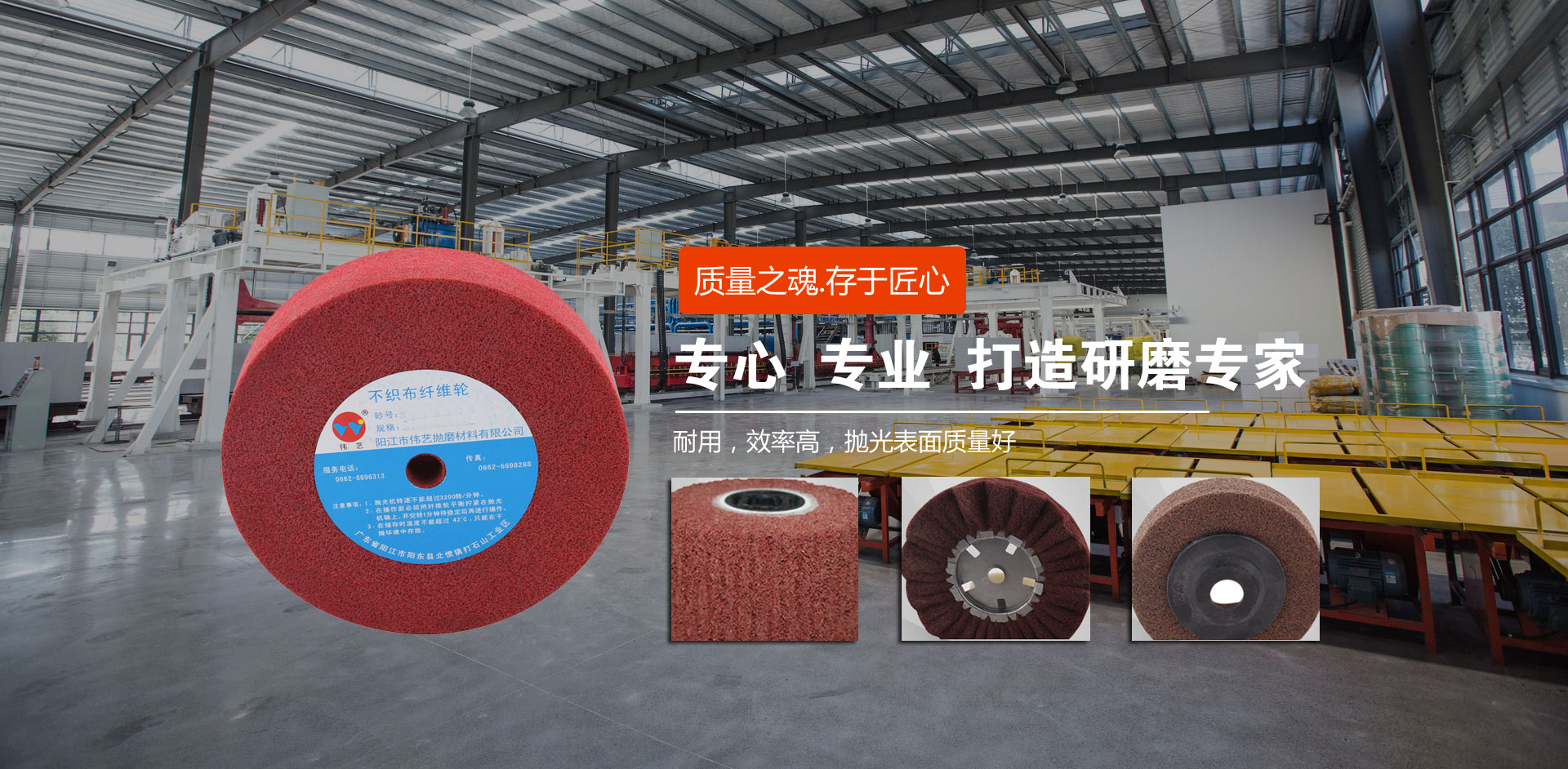 陽(yáng)江市偉藝拋磨材料有限公司座落于中國(guó)刀剪之都——陽(yáng)江市,具有近二十年尼龍輪生產(chǎn)和銷售經(jīng)驗(yàn),生產(chǎn)基地占地面積4.6萬(wàn)多平方米。偉藝公司立足自主研發(fā),致力于產(chǎn)業(yè)化發(fā)展。現(xiàn)已研發(fā)、生產(chǎn)了尼龍輪、擦色輪、飛翼輪、拉絲輪、清潔拋、不織布刷輥、工業(yè)擦布、塑膠研磨石、金剛砂、噴膠棉等十多種應(yīng)用于多種領(lǐng)域的研磨材料,并可以根據(jù)客戶的需求提供針對(duì)性解決方案和個(gè)性化服務(wù)。 偉藝公司致...